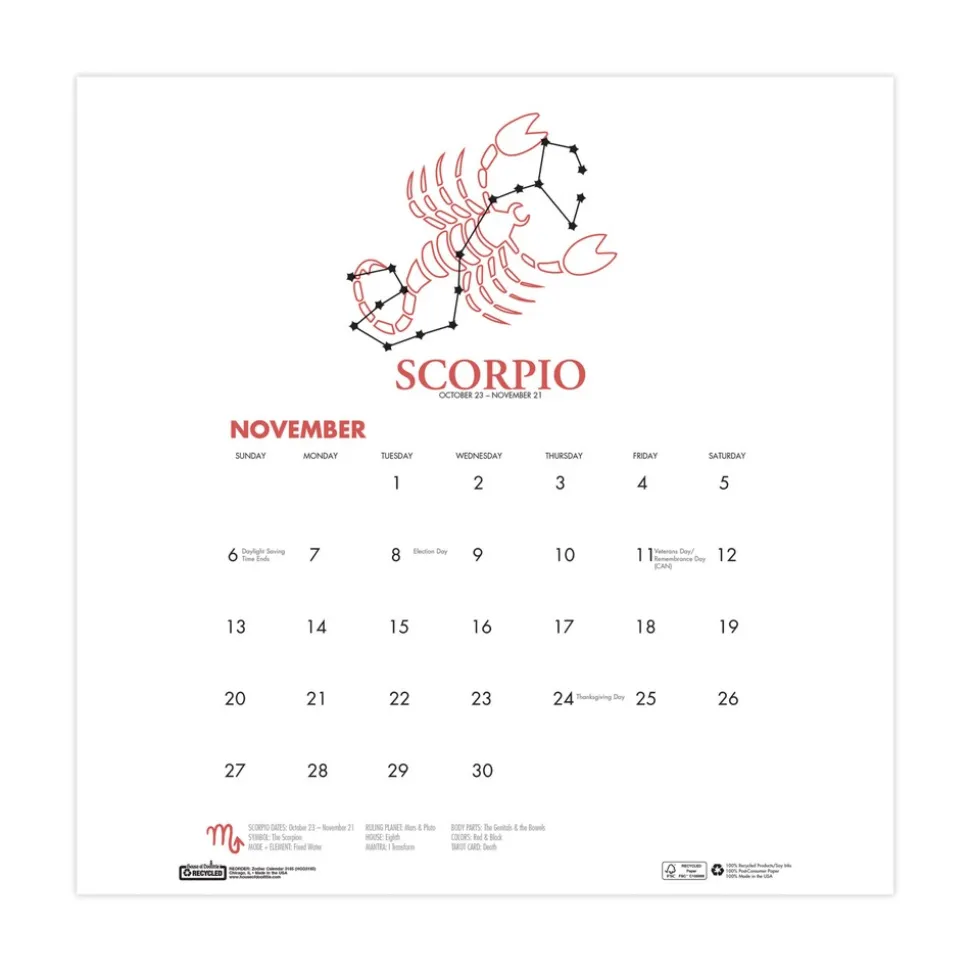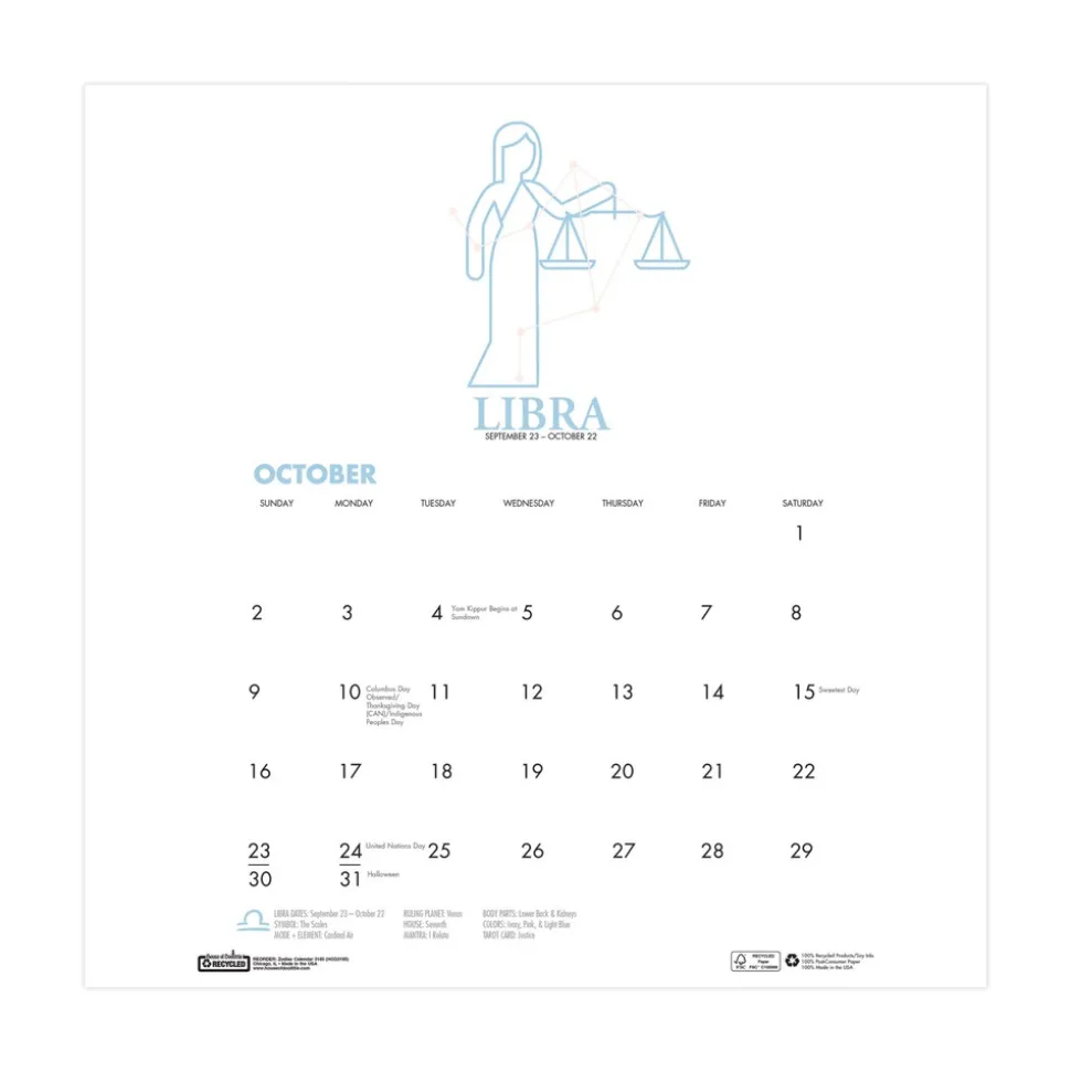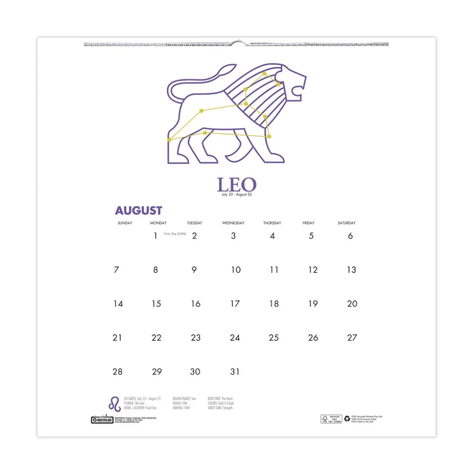 House of Doolittle 100 Percent Recycled Zodiac calendar has a clean open space design printed on heavy-duty 100-lb paper. Each month the zodiac symbol along with the star pattern is displayed with the astrological time frame of the month. It also displays information about the astrological sign which includes elements, dates, ruling plant, house, mantra, body part, color and tarot card. Perfect size for smaller work areas plus the horizonal orientation fits for lower work area walls.