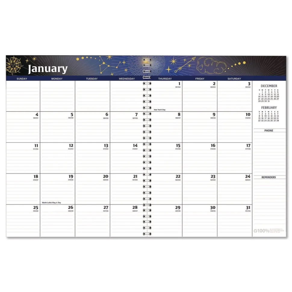 The Stargazer Monthly Planner features a celestial design element at the top of the page. It is wire bound with sturdy two-piece Stargazer leatherette cover to withstand the daily use throughout the year. Lightly ruled daily blocks keep notations neat. Includes a future plan page, time zones, three-year reference calendar page and a three-year holiday page. Each month has Julian dates, days remaining, previous and following month reference calendars. A handy double-sided pocket is included to store items.