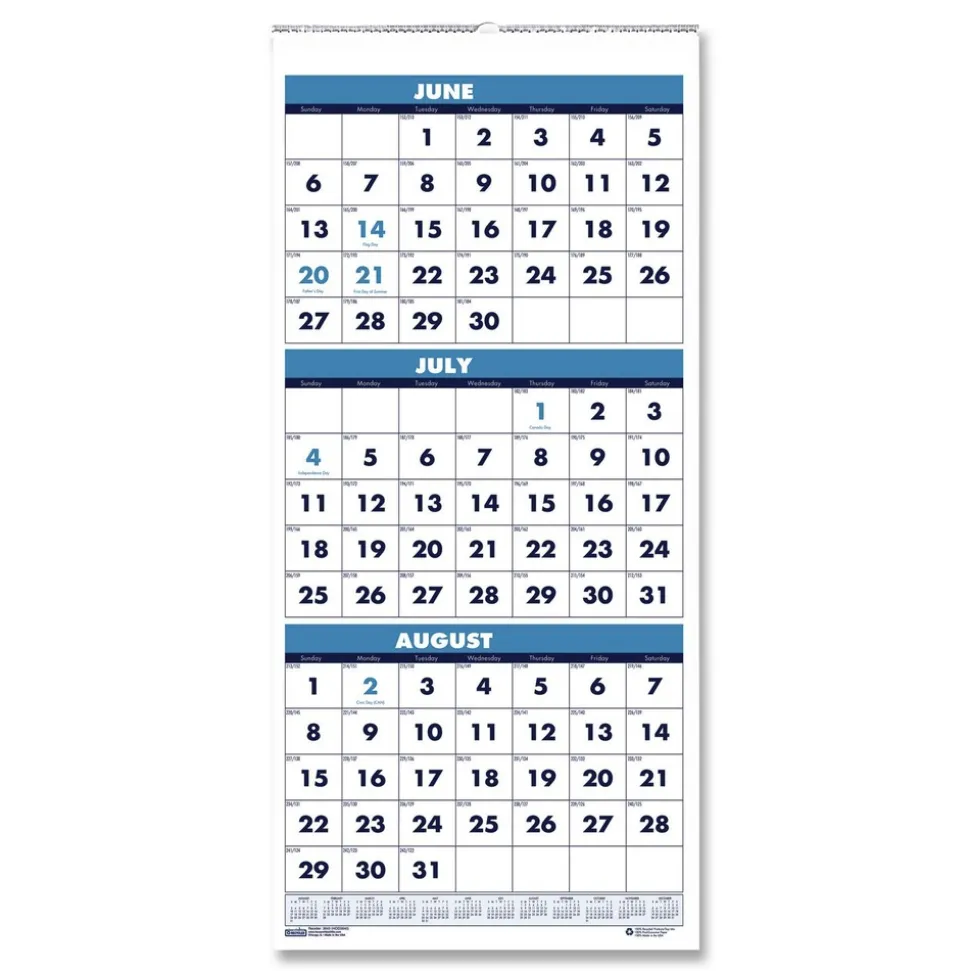 House of Doolittle 3645 14-Month: June 2025 to July 2026 8 in. x 17 in. Academic Year Recycled Three-Month Format Wall Calendar – White Sheets