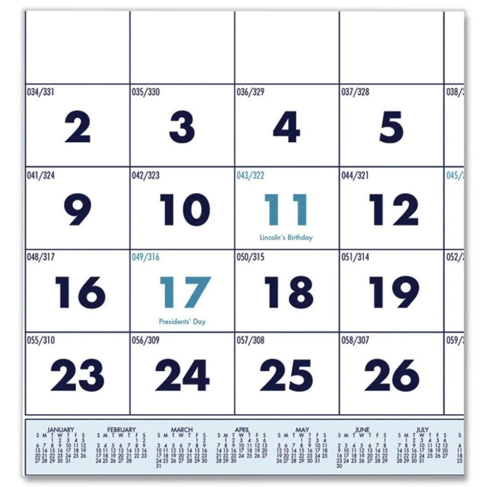 See three months at a time. Wall calendar details the prior, present and following month on each page. Large date numerals with holidays highlighted. Strong wire-binding firmly keeps the pages together and in place. Features a full, 12-month reference calendar for long-term planning. Sturdy wire hanger makes it easy to hang the calendar on the wall. Made entirely of recycled materials.