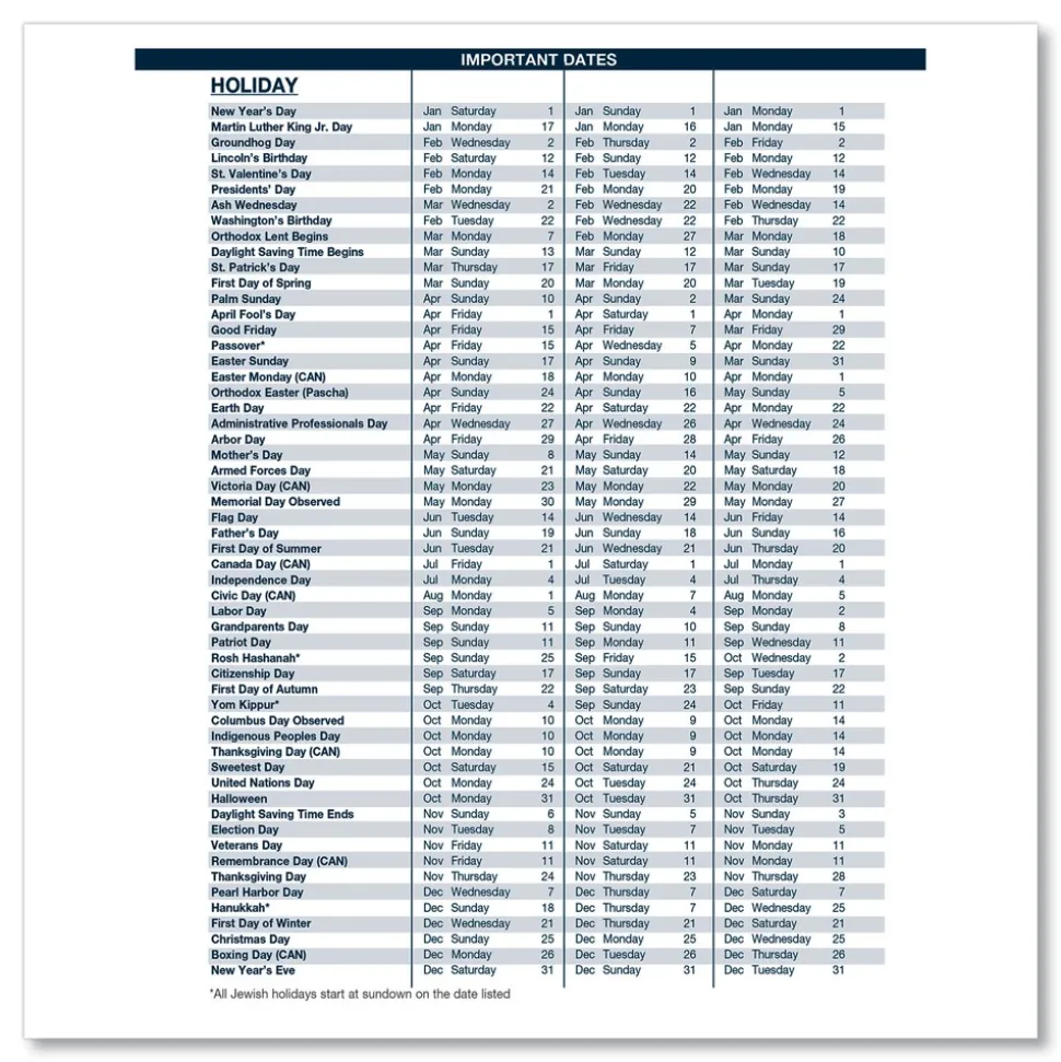 One month per two-page spread and one week per two-page spread so you can plan ahead
