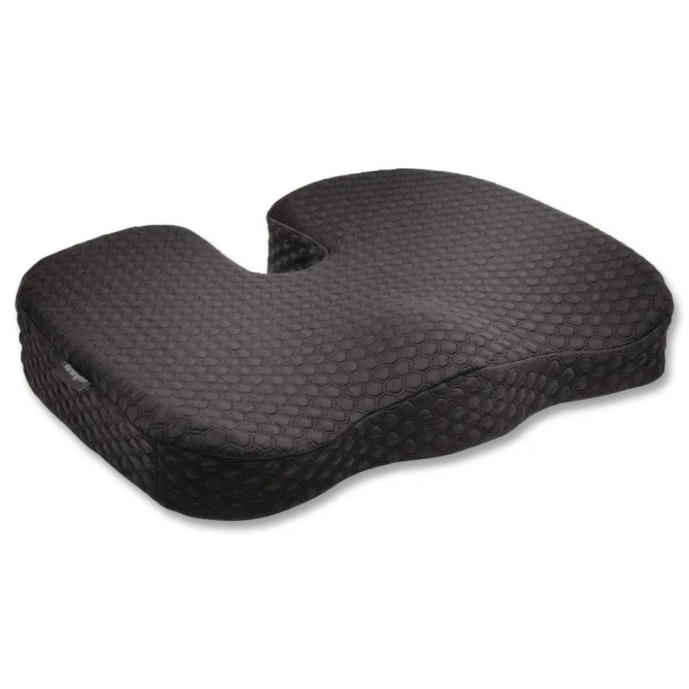 Cooling fabric with Cool-Gel core provides a certified decrease in body temperature for maximum comfort during extended periods of sitting. Ergonomic design promotes healthy posture, improves circulation and relieves spinal pressure. Zero tailbone pressure alleviates pressure on your spine using a unique u-shaped coccyx cutout to support sciatica relief by minimizing contact between tailbone and seat cushion. Premium honeycomb memory foam provides durable patent-pending structural support. Certified durability, independently verified to maintain thickness, provide ongoing support and keep seams intact beyond 80,000 uses. Machine-washable cover is easy to clean and maintains color wash after wash. Anti-slip backing prevents sliding using a high-quality silicone friction grip. Carrying strap makes it easy to transport between home, office, car and events.