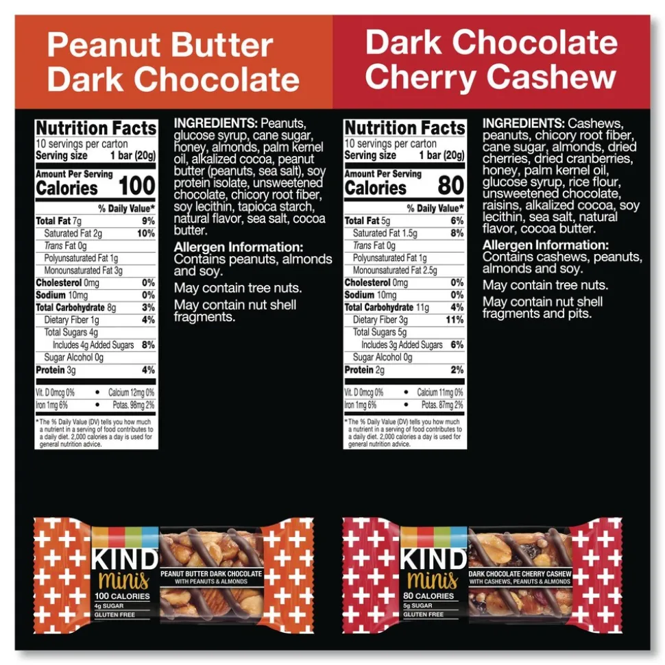 KIND 43012 0.74 oz Minis Variety Pack – Dark Chocolate Cherry Cashew/Peanut Butter Dark Chocolate (20/Box)
