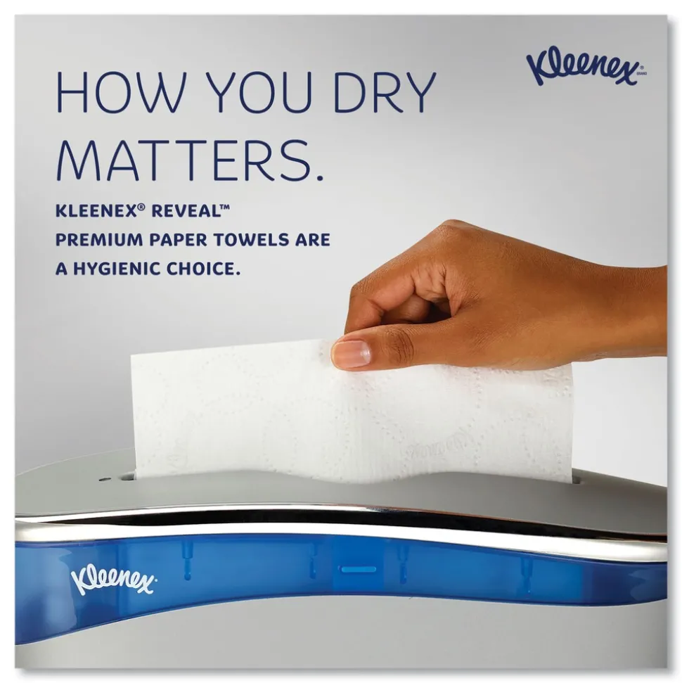 Using Kleenex Reveal Hand Towels with the Kleenex Reveal Countertop System offers your restroom guests an upgraded hand drying experience. Visitors take a towel without taking a step, so you can say goodbye to water splashes and sprays on floors and countertops. You’ll say hello to a solution that elevates the cleanliness and image of your facility by dispensing superior Kleenex Hand Towels. The white towels are embossed with the trusted Kleenex logo and offer a balance of softness and strength to dry hands thoroughly. These towels dispense one at a time, so you only touch the towel you use. Throw away those germs and you’ll enjoy peace of mind when it comes to the hygiene of your staff and your guests.