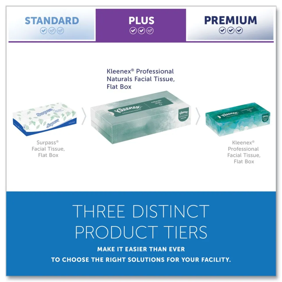 48 Flat boxes / case; 125 sheets / box (6000 sheets total): Each white Kleenex Naturals tissue is 8.3 in. x 7.8 in., 2-Ply, absorbent, soft and strong