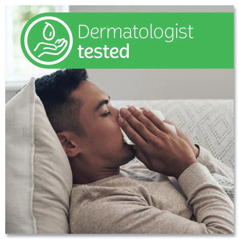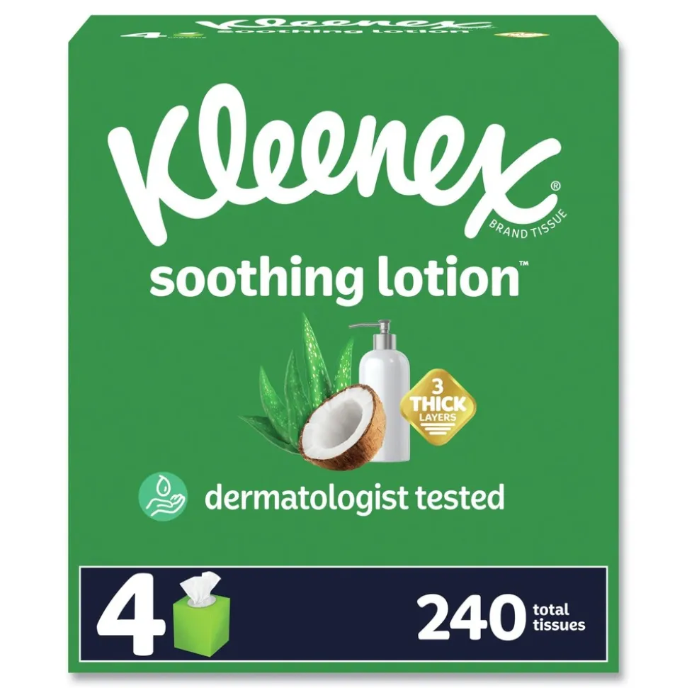 Soothing Lotion facial tissue features 3-layers of soft and strong paper, each infused with a touch of coconut oil, aloe and vitamin E, to nourish skin with daily moisturizers while protecting you from chafing and redness by locking that moisture in, no matter how many times you reach for a tissue during the day. These ultra-soft, lotion-infused tissues are ideal when suffering from colds and allergies, and they may be the only tissues for those who suffer with sensitive skin throughout the year.