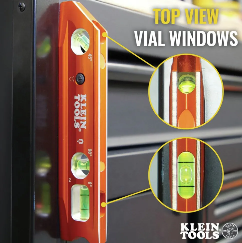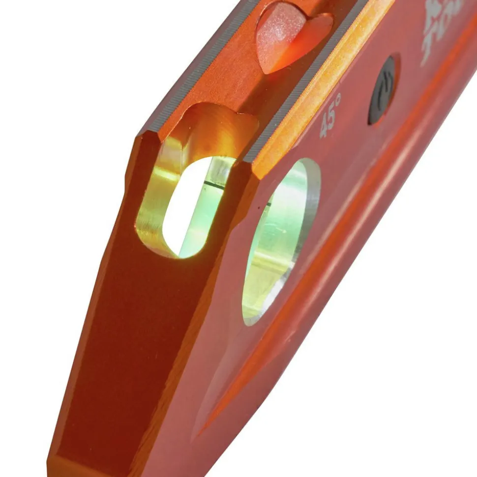 Klein’s Lighted Billet Aluminum Torpedo level saves time and rework with its high precision and accuracy. Powerful rare earth magnets with patented magnet track secure the level to any metal surface.Three large vials identify Level, 45 and 90 Degrees. The bright LED high-definition of each are easy to read in any lighting condition. The level surface is precision ground and machined flat for increased accuracy. Durable aluminum ensures a long productive life while the high-visibility orange makes this level easy to find on conduit or the jobsite.