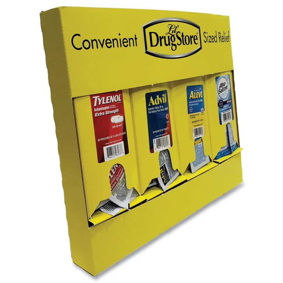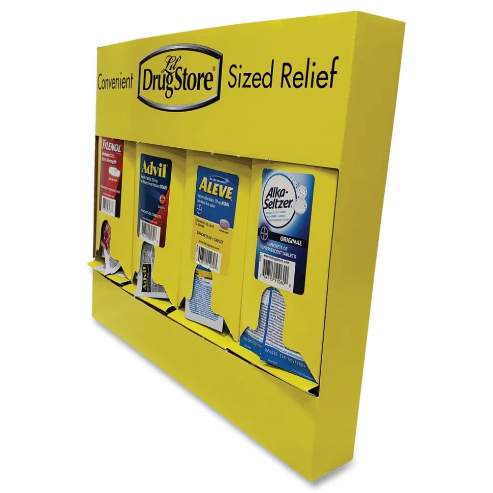 Improve productivity by keeping employees at their station when minor maladies occur. Mounts on a wall or back of a door with two screws or picture hangers (not included). Keep primary OTC medicines handy. Medicine dispenser comes with four medicines. Refill with any medicine refill.