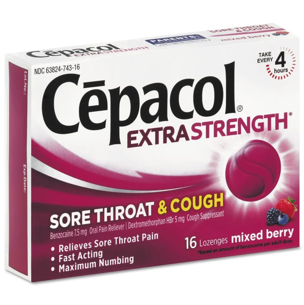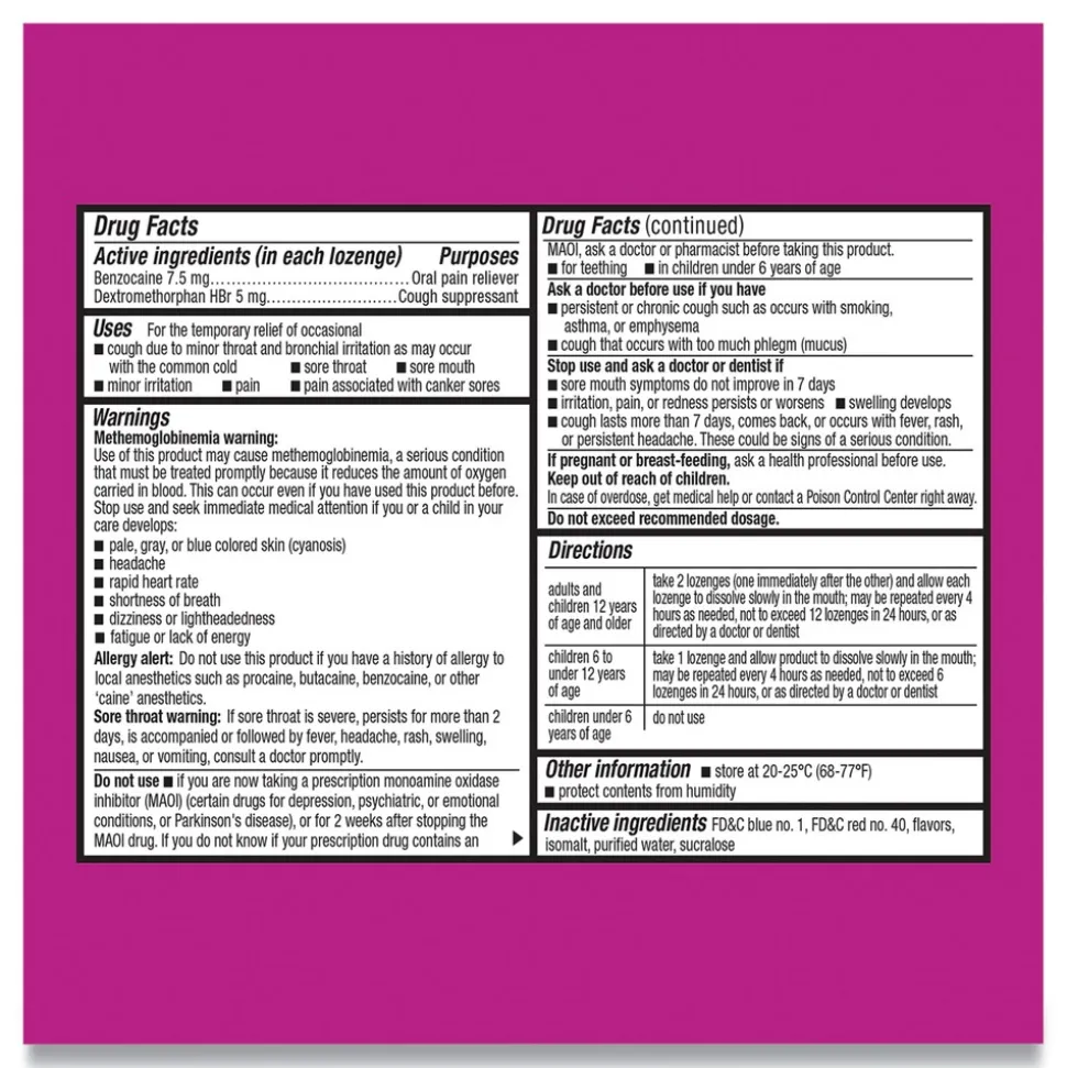 Instantly relieves sore throat pain with a numbing anesthetic. Also contains a proven cough suppressant to relieve irritating cough.