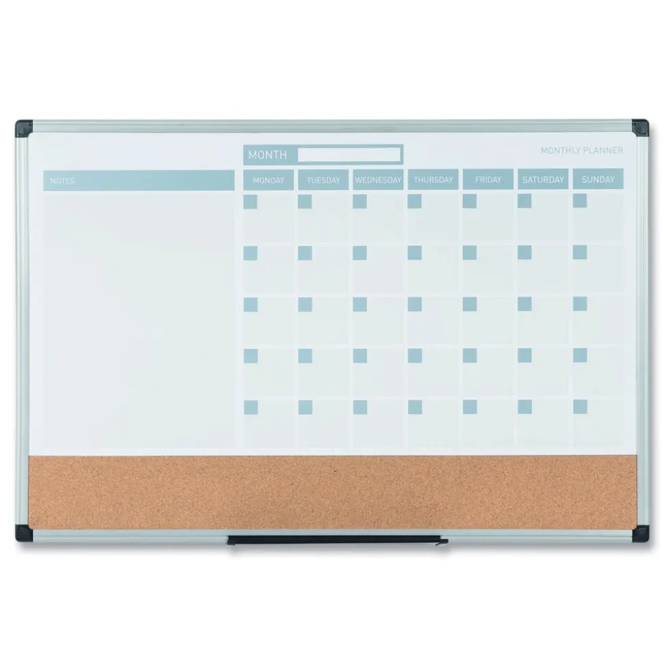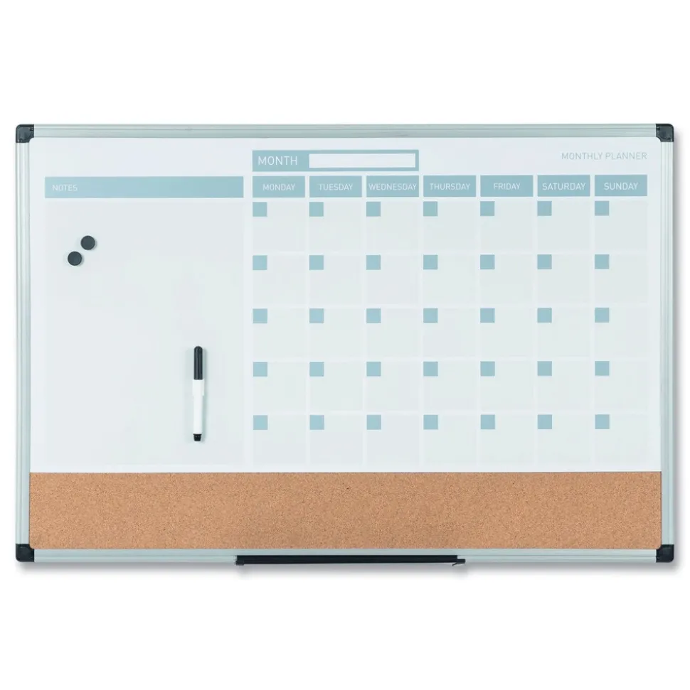 Functionality times three. This dry-erase calendar planner provides space for lists and a bulletin board surface for important cards and notes. Designed to fit in smaller spaces, MasterVision personal home and office products can be used in any working context, boosting performance either in individual or team work.