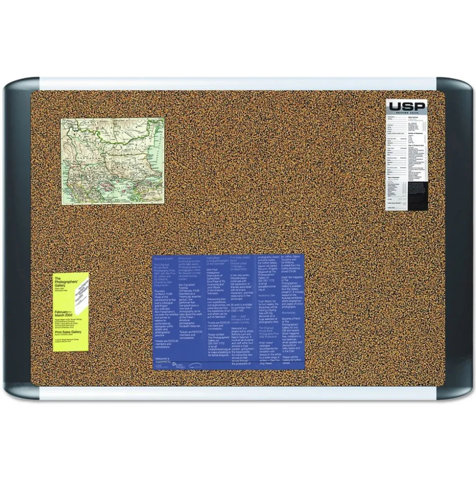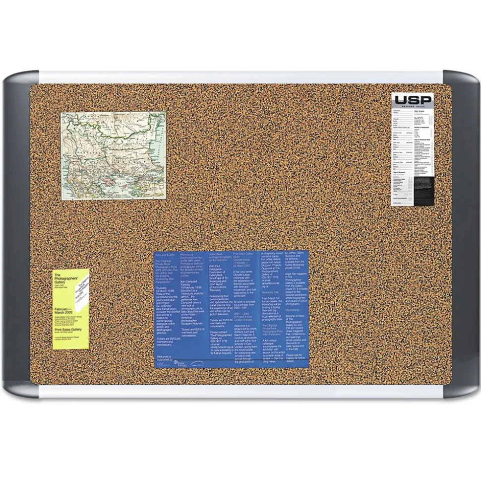 Tech cork is a special self-healing bulletin board surface based on a fine blend of cork and rubber. Thick and extremely resilient, the unusual surface offers a texture that gives these boards a contemporary look while providing years of use. The aluminum and plastic contemporary frame enhances any office environment.