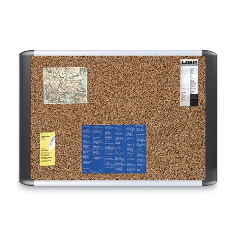 Tech cork is a special self-healing bulletin board surface based on a fine blend of cork and rubber. Thick and extremely resilient, the unusual surface offers a texture that gives these boards a contemporary look while providing years of use. The aluminum and plastic contemporary frame enhances any office environment.