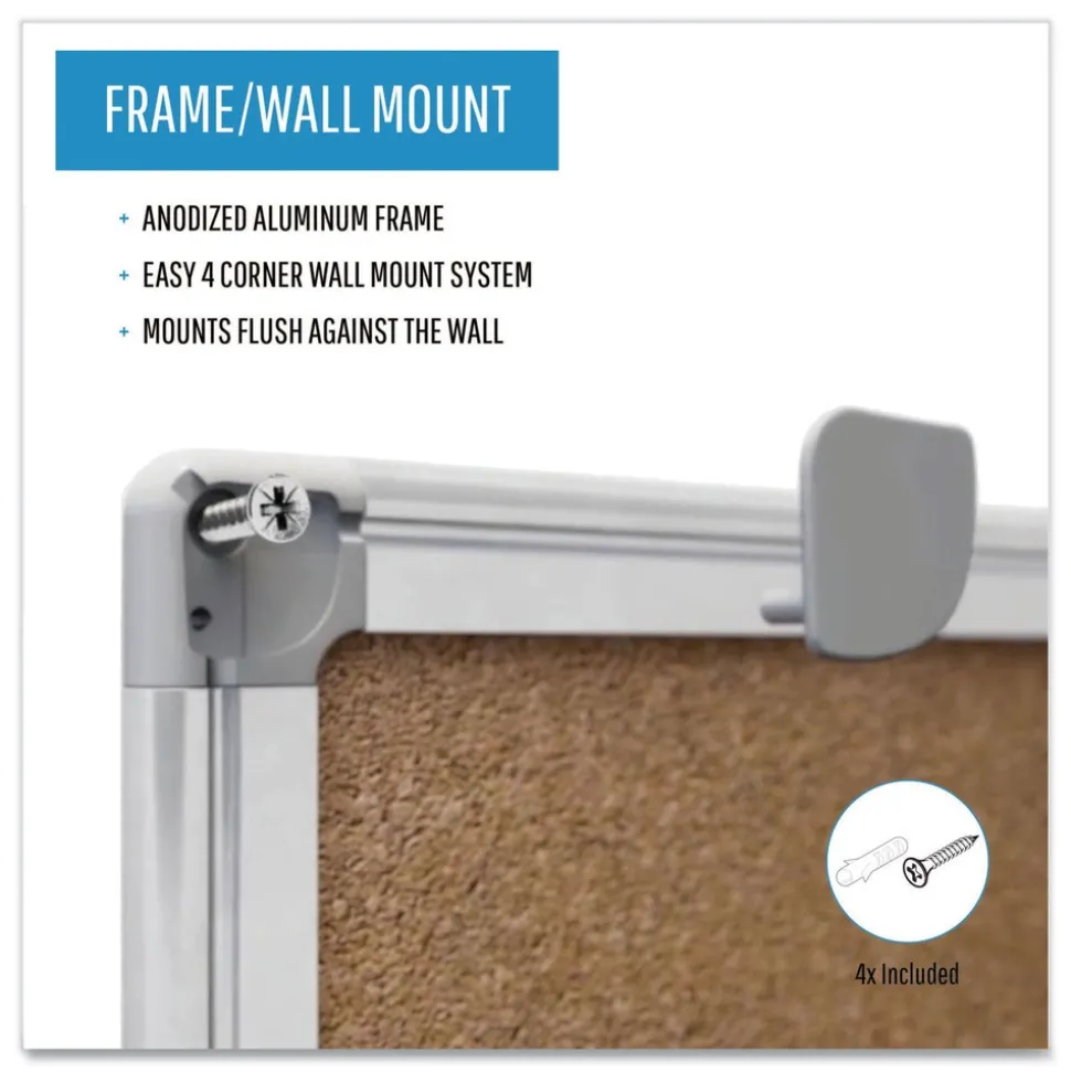 Bulletin board is an efficient and versatile solution for visual communication. Decorative and practical, it’s a tool that serves as an important aid to sharing information. Manufactured using post-consumer and post-industrial waste, it’s also nearly entirely recyclable. Real cork surface is extremely durable and resilient. Sturdy aluminum frame features an easy to mount four-corner system. Hardware included.
