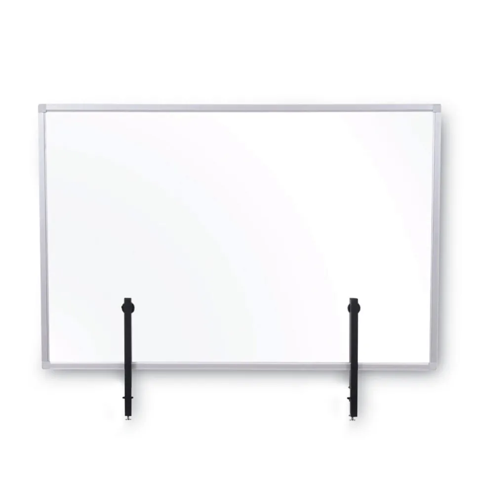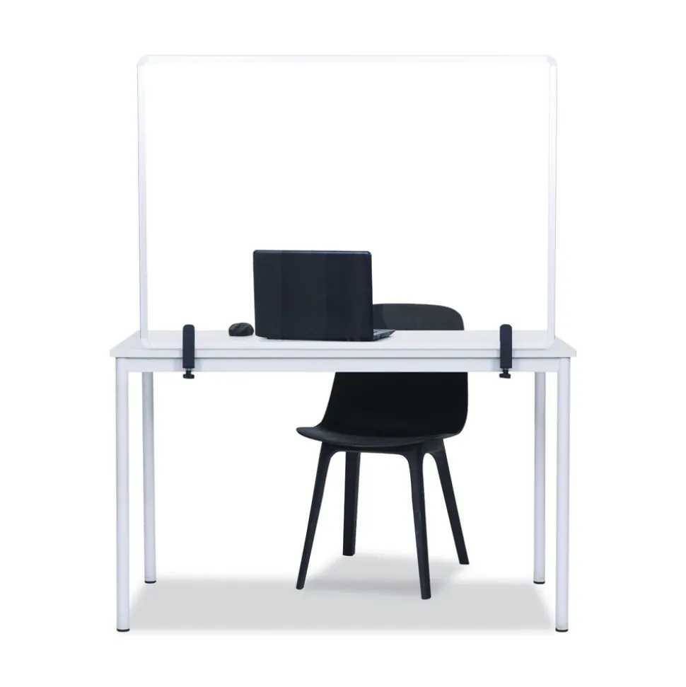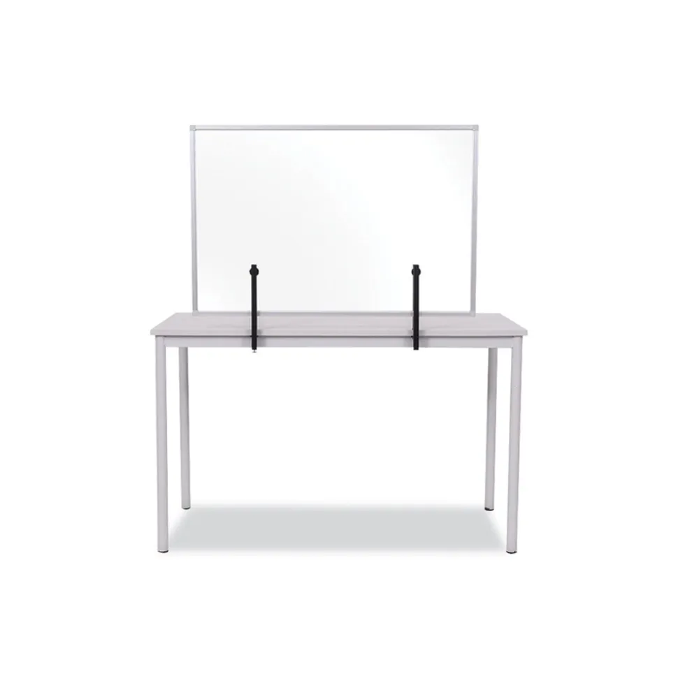 Due to the COVID-19 pandemic, social distancing and personal protection have become the new norm in order to stay safe. MasterVision introduces to you the Protector Series, designed specifically to protect you in public spaces. Transparent Glass Aluminum Desktop Divider allows users to stay protected while maintaining visibility. Ideal product for desks and tables across multiple areas such as offices, restaurants and other public settings. Features an aluminum frame and a pair of robust clamps which attach to the tabletop or desktop.
