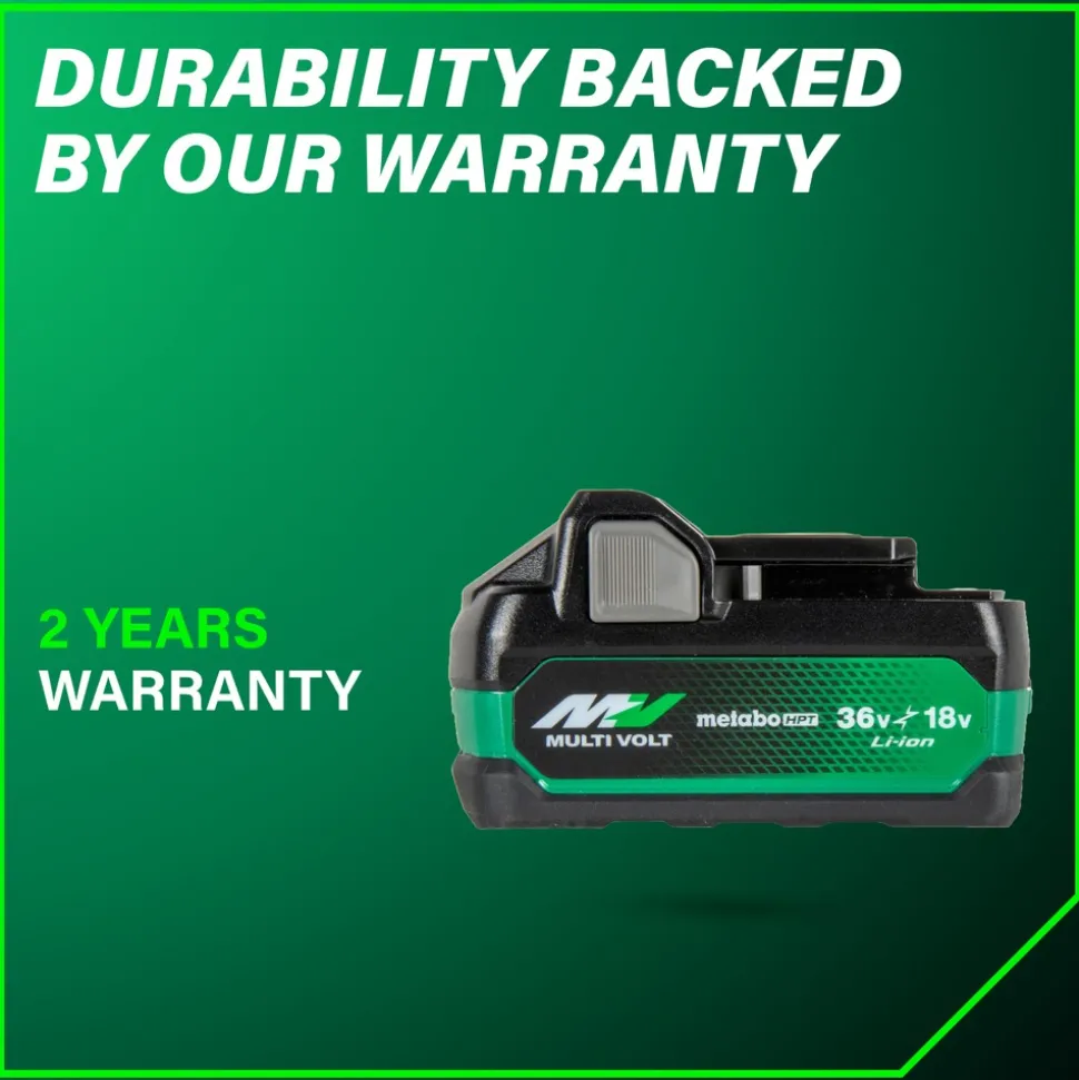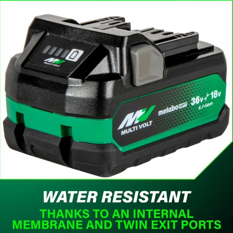 The MultiVolt Lithium Ion Water and Impact Resistant Battery (Model BSL36A18X/ part #380083M) is the next generation of high power Metabo HPT MultiVolt batteries to fuel our expanding line of 18V and 36V tools. For better defense against moisture related short circuiting, a waterproof barrier exists for the internal cell terminals and twin exit ports for water that gets inside the battery pack. To lessen damage from drops and rough use on the job site, an impact resistant protective layer provides 15% more shock absorption and a longer battery life than previous models. It has a 5 Ah capacity when used with 18V tools and 2.5 Ah capacity when used with 36V tools and features a battery fuel gauge for user convenience. The innovative design of this MultiVolt battery helps prevent overheating when pushed to the limit, and works at temperatures as low as 14 degrees F (-10 degrees C). The MultiVolt Lithium Ion Battery platform changes what’s possible on the jobsite by offering the power of a corded tool, the freedom of a cordless platform and the choice to operate all Metabo HPT cordless tools. The 18V/36VMultiVolt Water and Impact Resistant battery comes with a 2 year warranty. Every Metabo HPT battery is designed to the highest standards and is rigorously tested for both performance and durability.