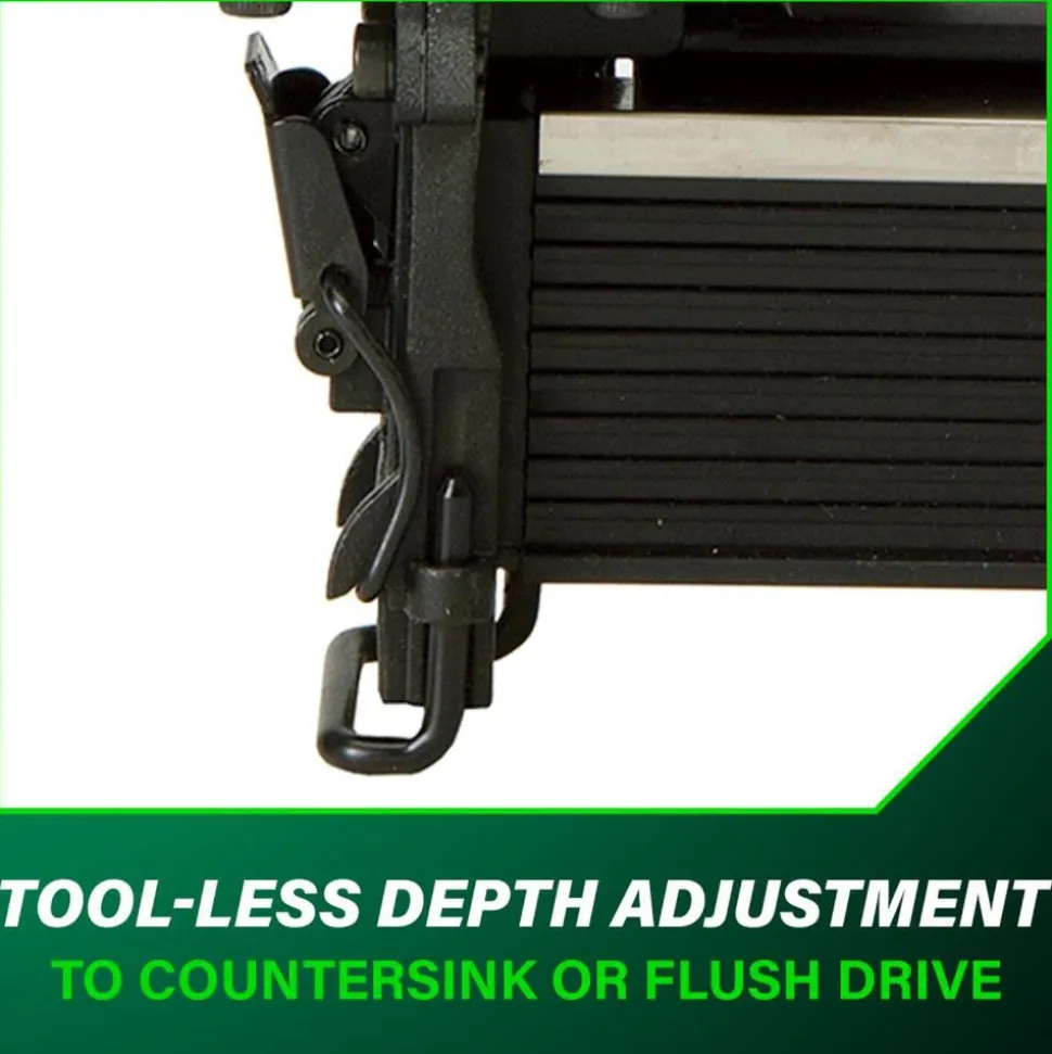 Lightweight pneumatic design with tool-less depth adjustment and easy loading.