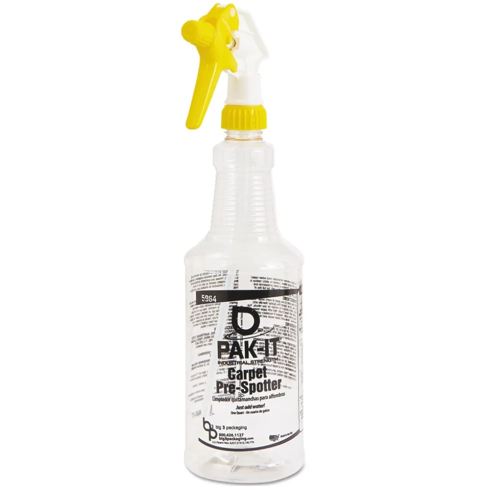 Simply drop two pre-measured yellow Carpet Pre-Spotter PAK-Its into its matching yellow quart trigger spray bottle (sold separately) and add cold, tepid or warm water. Wait two minutes and shake. Adjust nozzle to mist or stream settings and spray liberally onto stain. Allow the product to sit on the stain for one to two minutes to absorb the stain. Rub gently with a hand brush then blot with paper towel or cloth. Repeat if necessary until stain is removed. Finally rinse with a little clean water and blot dry. If using a carpet steamer or extractor, spray on stain before use. Note always test for colorfastness on an inconspicuous surface area. Note: This is the only PAK-IT Quart Bottle product that requires 2 PAK-Its not 1.