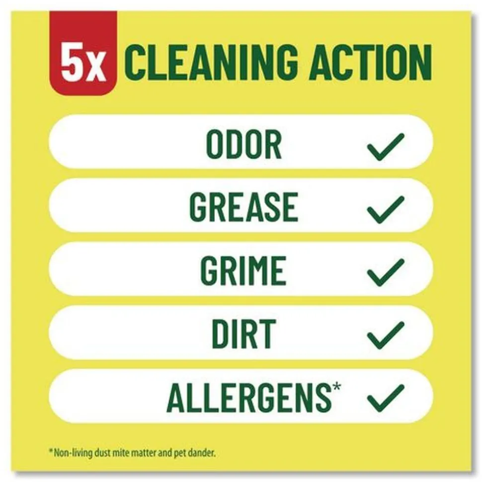 Deodorizes, cuts through grease, removes grime, tackles tough dirt and removes 99% of allergens.