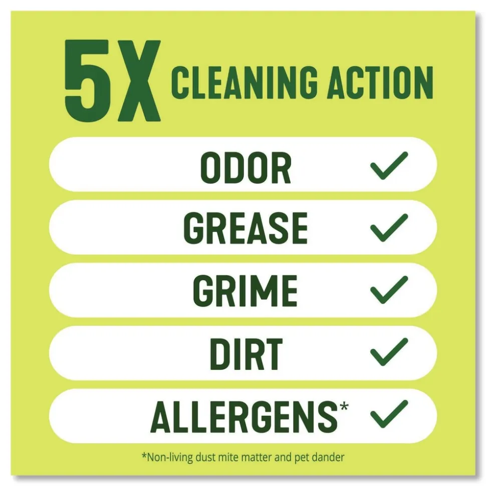 Deodorizes, cuts through grease, removes grime, tackles tough dirt and removes 99% of allergens