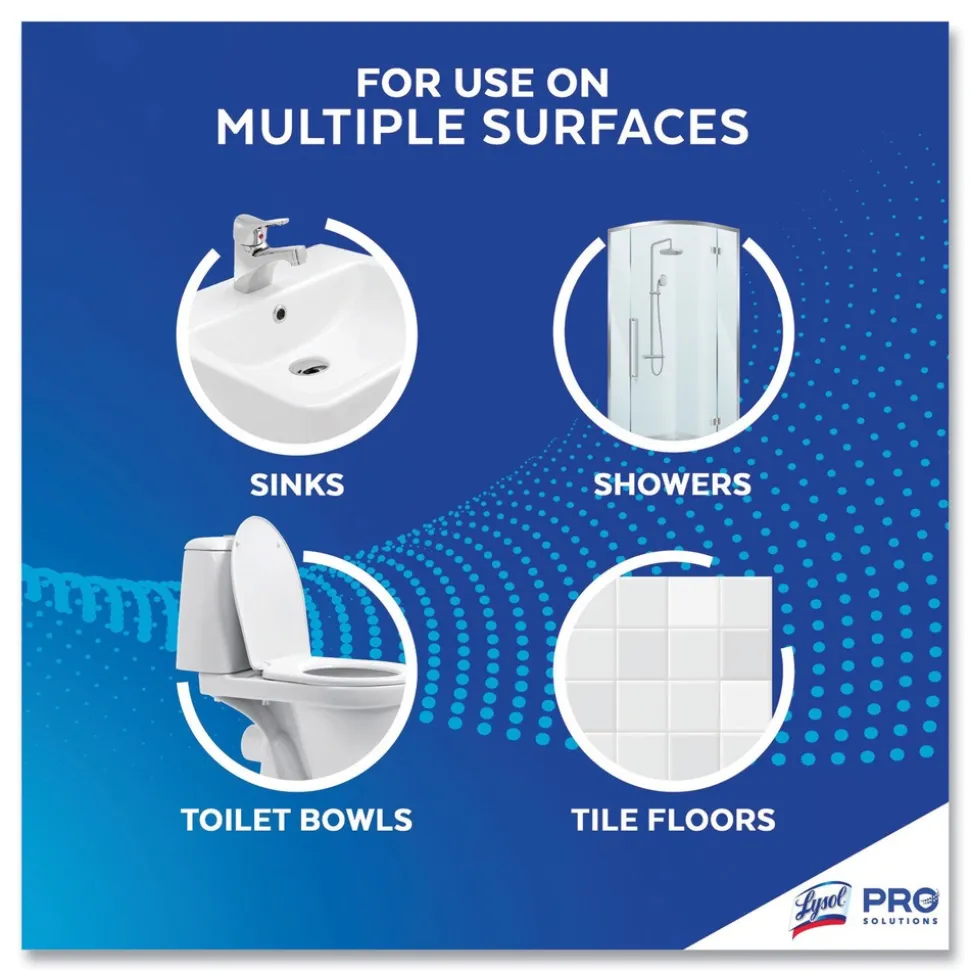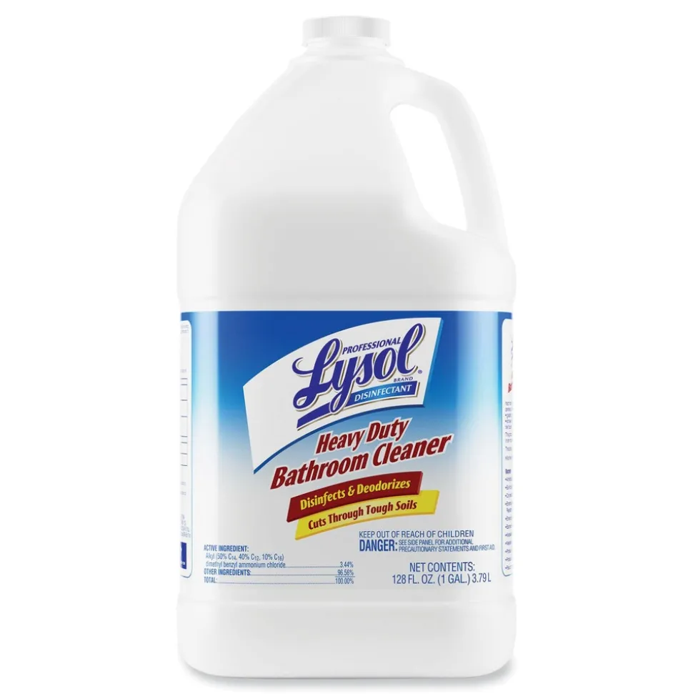 Optimize cleaning time with a bathroom cleaner that disinfects, deodorizes, and cuts through tough soils. Arm your cleaning staff with the cleaning action of Lysol Professional Disinfectant Heavy Duty Bathroom Cleaner. Kill 99.9% of viruses and bacteria (including Rotavirus WA) when used as directed on hard, non-porous surfaces. Maintain cleaning protocols in high-volume facilities with a concentrated formula that’s easy to dilute. Reduce how often you have to restock janitorial supplies with the concentrated formula. This product has been formulated to thoroughly clean, disinfect and deodorize tub and shower areas and other hard non-porous surfaces such as glazed ceramic bathroom tile, sinks, toilet bowls and surfaces, garbage cans, bathtubs, shower stalls, chrome and clear acrylic plastic fixtures, glazed porcelain and glazed ceramic tile floors.
