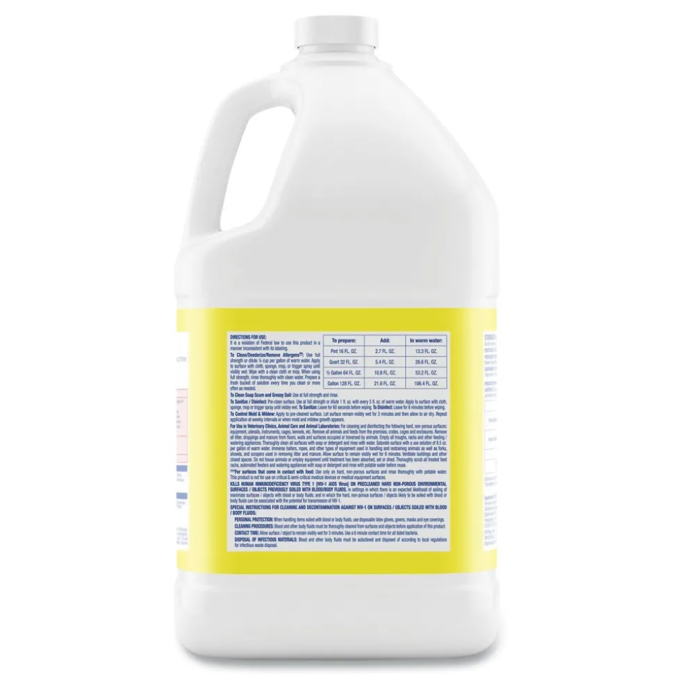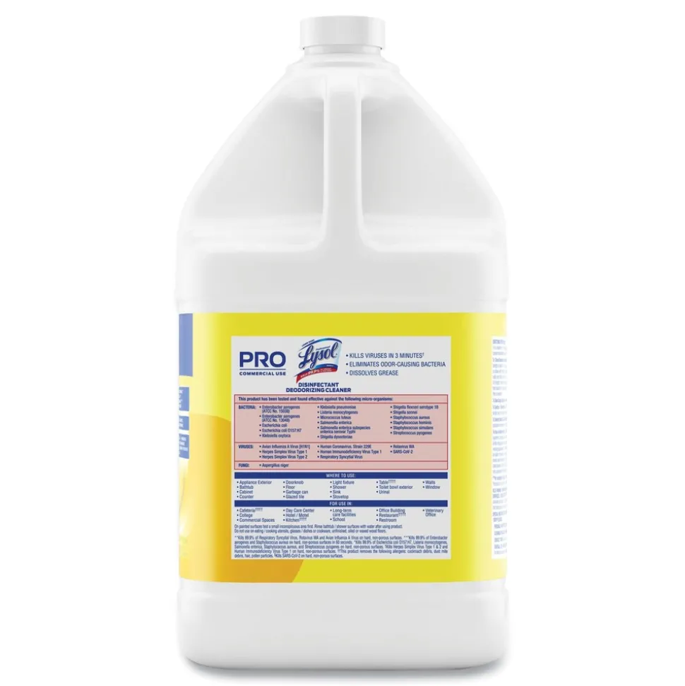 Optimize cleaning efficiency and meet commercial disinfection needs with Professional Lysol Disinfectant Deodorizing Cleaner. Give cleaning crews a versatile formula that cleans, disinfects, and deodorizes. This economical, concentrated solution makes up to 64 gallons of cleaning action that crews can use on a wide range of hard, non-porous surfaces when used as directed. To disinfect, dilute 1 oz of product with 5 oz of water. This product is bactericidal, virucidal, and germicidal when used as directed. Destroy 99.9 percent of bacteria in 60 seconds. Remove dirt, grease, and grime, and leave behind a familiar lemon scent.