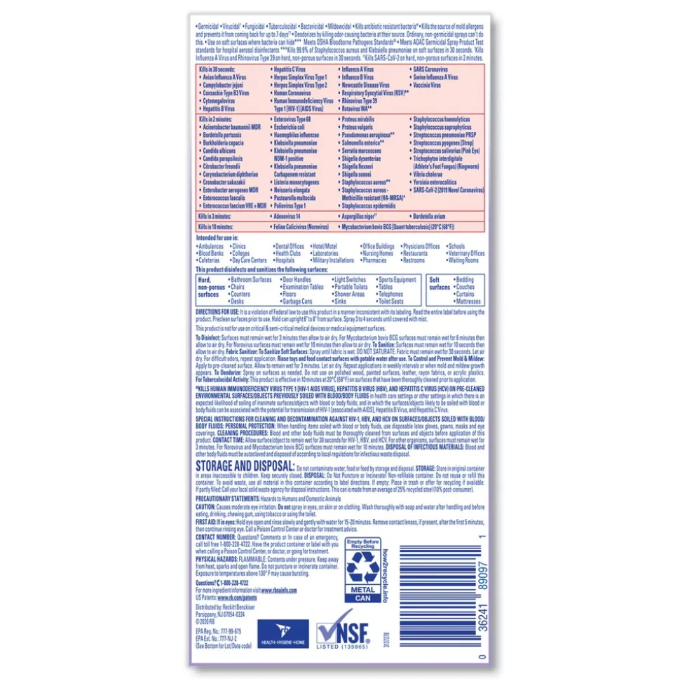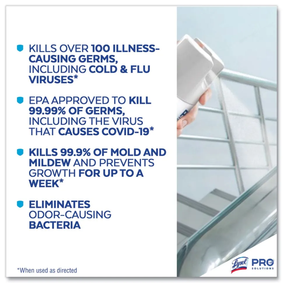 Boost customer confidence with Lysol Professional Disinfectant Spray that’s safe to use on hard and soft surfaces. Lysol kills 99.9% of viruses and bacteria, including the virus that causes COVID-19 in 15 seconds, as well as cold and flu viruses when used as directed. Help protect high-traffic areas and high-touch surfaces, including desks, bathrooms, doorknobs, and railings. Deliver hospital-type disinfection into soft surfaces, including upholstery, curtains, sofas, mattresses, and cushions. Meet customer and staff expectations around disinfection. Simply spray and let air dry.