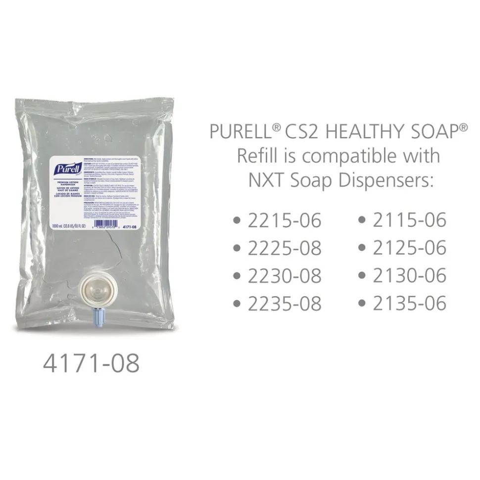 Show you care for employees and visitors with PURELL HEALTHY SOAPâ„¢ Premium Lotion Handwash. As a high-performance, gentle lotion soap designed for general handwashing, this formula is mild enough to use repeatedly throughout the day. Because the formula is triclosan-free, it won’t dry out or irritate skin. The formula is dye-free with a waterfall fragrance and gently removes dirt and germs from hands. Each refill is SANITARY SEALEDâ„¢ to help prevent contamination and includes a fresh dispensing valve. These 1000 mL refills work with the PURELL CS2 Manual Hand Soap Dispenser (sku 4131-06, sold separately). This CS2 soap refill is also compatible with NXT Dispensers (2215-08, 2225-08, 2230-08, 2235-08, 2115-06, 2135-06, 2125-06, 2130-06); NXT dispensing platform is being discontinued.