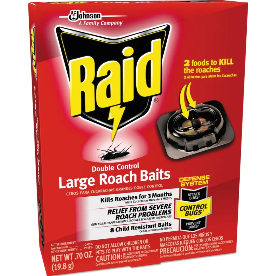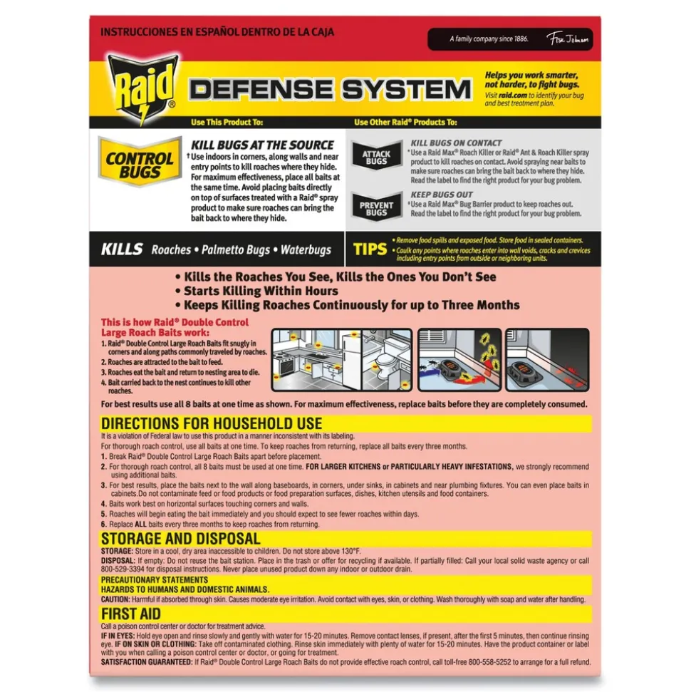 Raid Double Control Roach Baits kill the roaches you see as well as the ones you don’t see with two types of bait. After roaches feed on the bait, they return to the nest and transfer the bait to the others. Population reduction and less activity can be expected within days, with the baits working continuously for up to three months. Raid Double Control Roach Baits are child-resistant. Read label before use. Use only as directed.