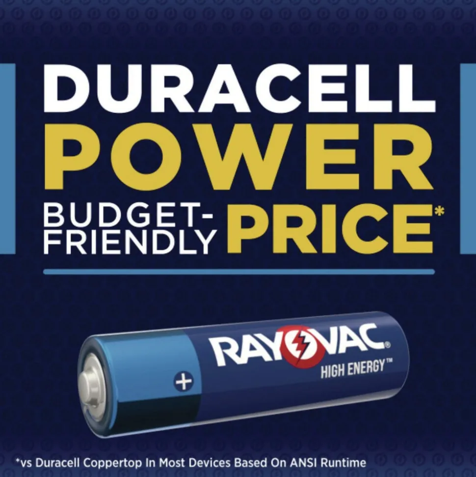 Power your household with Rayovac High Energy Alkaline Batteries. Engineered for long-lasting performance, these Rayovac batteries are ideal for the high use devices in your home, including flashlights, wireless mice, remotes and, smoke detectors, smart home devices and more. Rayovac rigorously tests its batteries to ensure they do what they say they’ll do-plain and simple. These alkaline batteries are backed by a 12 Year Power Guarantee to last up to 12 years in storage (5 Year Power Guarantee for 9V). Each battery is made for dependable performance. For reliability in the devices you use each day, count on Rayovac batteries.
