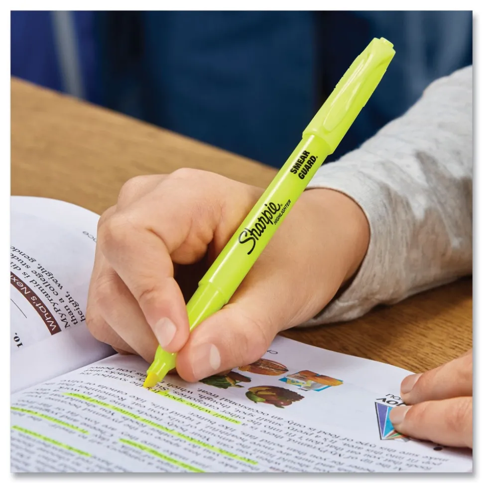 Features SMEAR GUARD ink specially formulated to not smear when highlighting over many pen and marker inks including inkjet printouts, written notes, newspapers and more. Versatile chisel tip is great for highlighting or underlining. Quick drying, odorless ink won’t fade type or bleed through most paper.