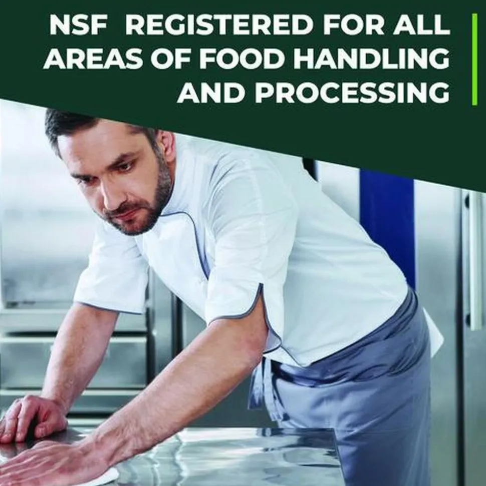 NSF registered A1, A4, A8, C1 for use as a general cleaner in all food processing facility areas including cooking and smoking equipment, floors, walls, and utensils