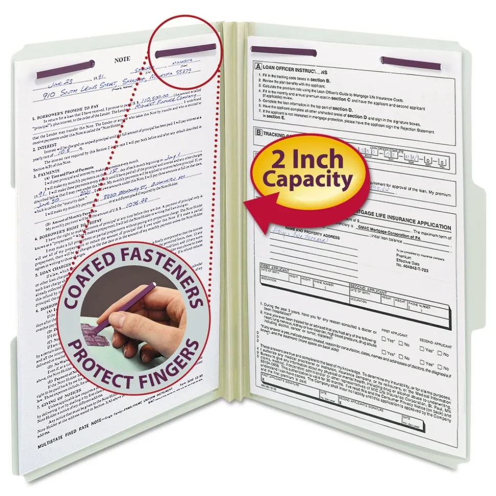 Protect your documents and fingers with Smead patented SafeSHIELD Coated Fastener Technology; the ultimate solution to fastener issues, including paper tears, finger cuts and excessive fastener crinkling. Made for large, bulky files that get plenty of use. Excellent for project files, loans, legal files or anytime you need to keep large amounts of paperwork in sequential order for frequent reference.