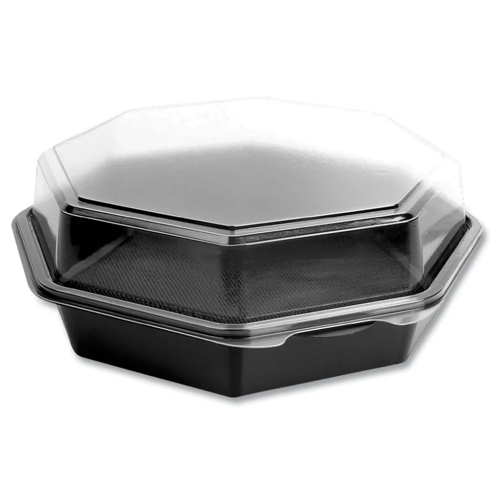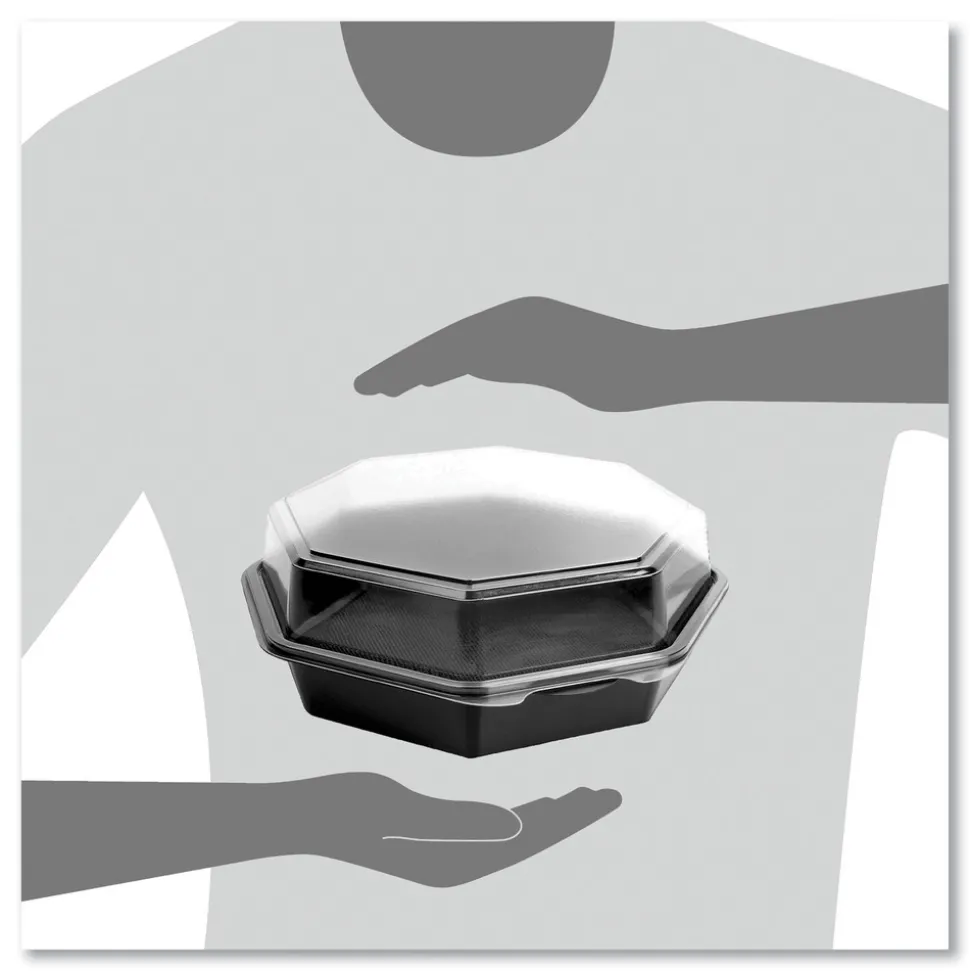 SOLO 864056-AP94 OctaView 9.57 in. x 9.2 in. x 3.2 in. 42 oz. Plastic Hinged-Lid Cold Food Containers – Black/Clear (100/Carton)