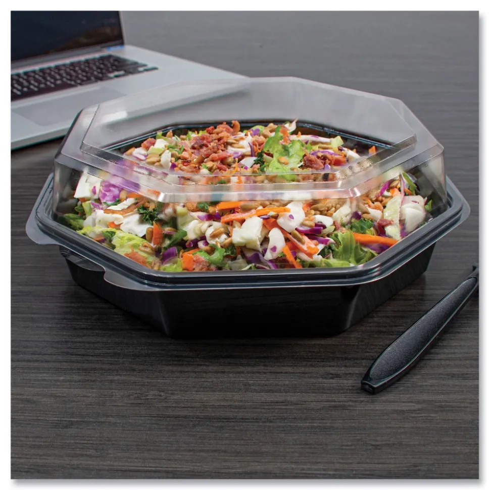 Create enticing displays by showcasing meals in our high-quality, upscale packaging. The unique octagon shape and hinged-lid design looks great and makes merchandising easier. Worry less about leaks and messes with the secure perimeter seal. Transport easily and securely, our containers have a stackable base. Perfect for food delivery, grab-and-go counters, grocery stores and cafeterias. No matter what’s inside— from saucy pastas to salads loaded with toppings and dressings— these containers keep food fresh, mess-free and looking good.