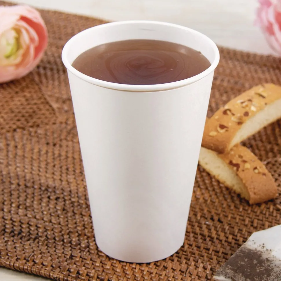 Insulated, double wall paper cup eliminates the need for a sleeve.