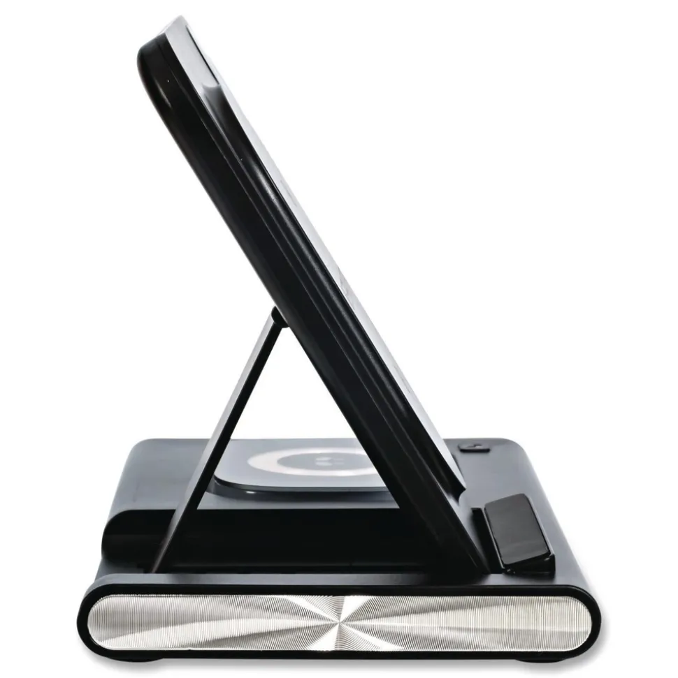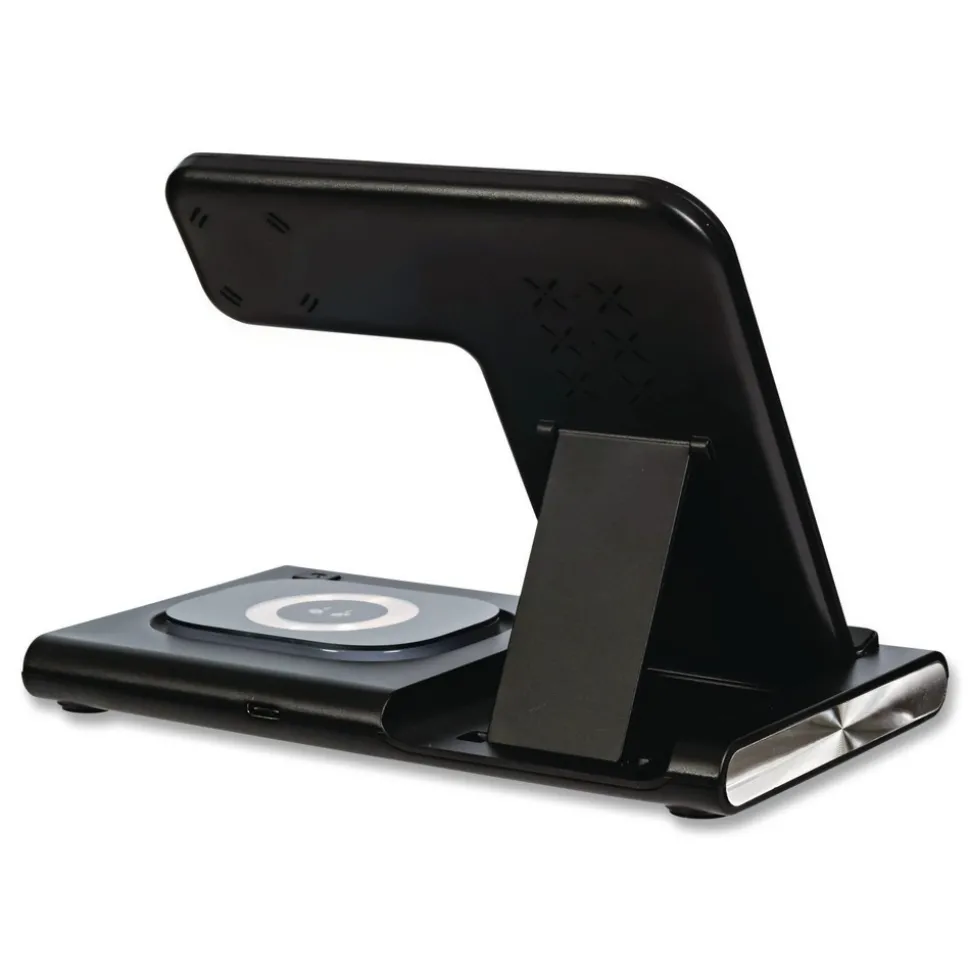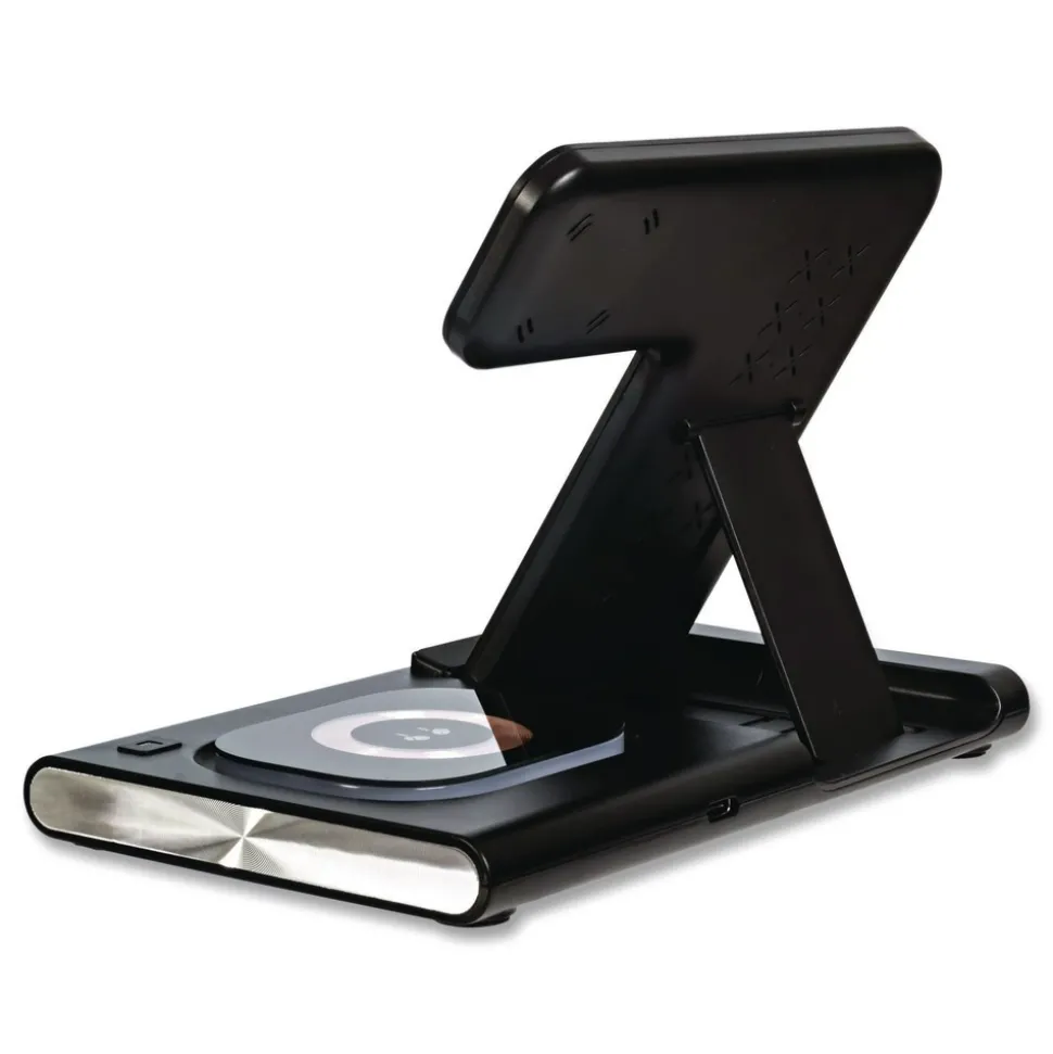 3-in-1 foldable wireless charging station that allows the station to be collapsed flat for easy storage or for travel; when collapsed it will easily fit in your travel backpack, laptop case or purse