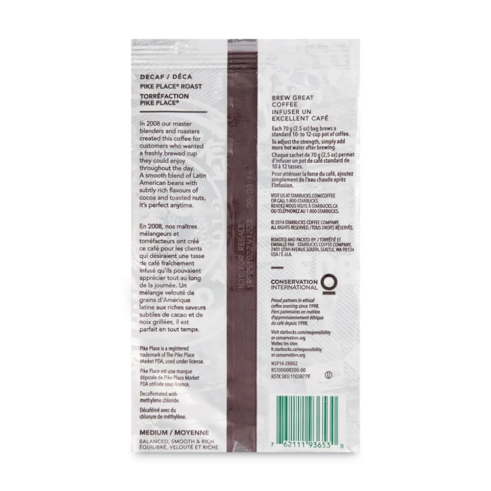 Starbucks 12420994 2-1/2 oz Packet Coffee – Pike Place Decaf (18/Box)