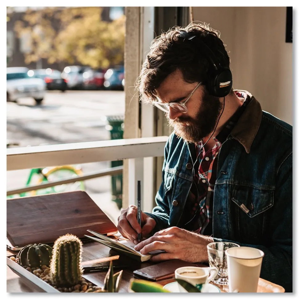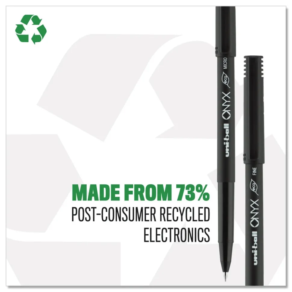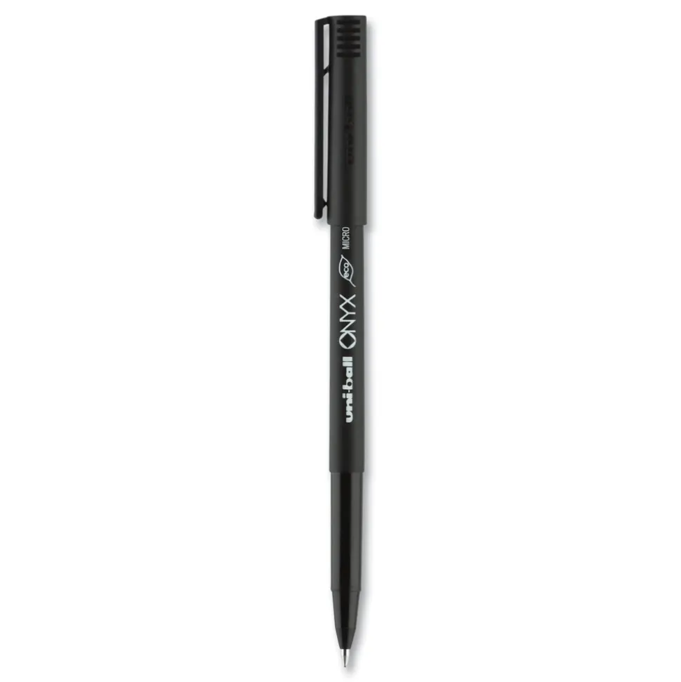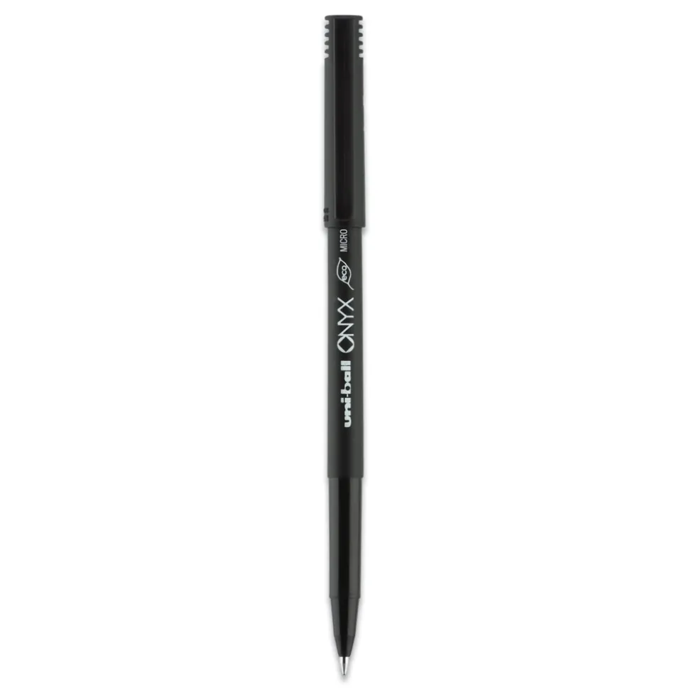 Stock your office, home or classroom with Onyx Rollerball Stick Pens from uni-ball featuring strong, long lasting tip sizes. This rollerball pen delivers the silky-smooth glide of a fountain pen without smudging for effortless writing. ONYX pens produce crisp and precise lines for intricate writing, making it easy to create super fine details in your drawings and diagrams. Capped roller pens are useful for a variety of tasks from note taking to signing checks and legal documents to uniquely embellishing fun and creative writing projects. Innovative uni Super Ink technology forms a strong bond with the paper, protecting from water, fading and fraud. A great economic and environmentally-conscious choice as this super sleek micro point roller pen is made from post-consumer recycled material.