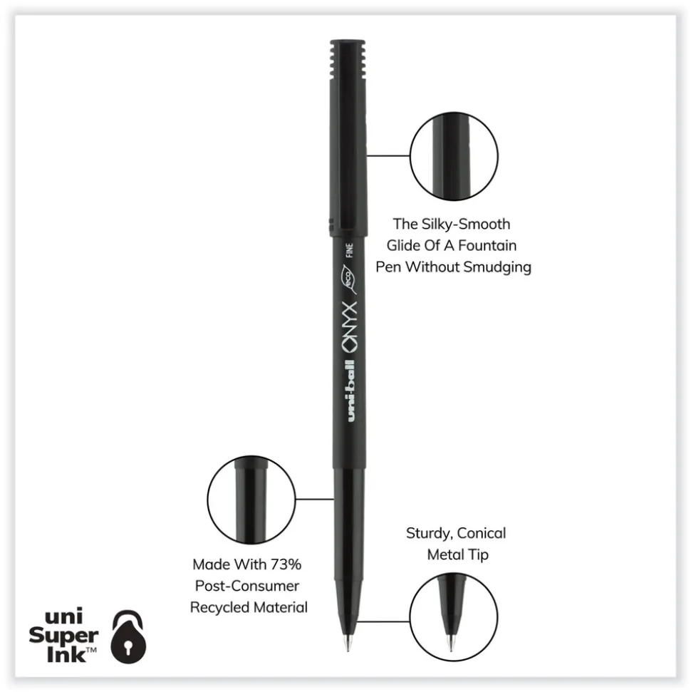 Stock your office, home or classroom with Onyx Rollerball Stick Pens from uni-ball featuring strong, long lasting tip sizes. This rollerball pen delivers the silky-smooth glide of a fountain pen without smudging for effortless writing. ONYX pens produce crisp and precise lines for intricate writing, making it easy to create super fine details in your drawings and diagrams. Capped roller pens are useful for a variety of tasks from note taking to signing checks and legal documents to uniquely embellishing fun and creative writing projects. Innovative uni Super Ink technology forms a strong bond with the paper, protecting from water, fading and fraud. A great economic and environmentally-conscious choice as this super sleek micro point roller pen is made from post-consumer recycled material.