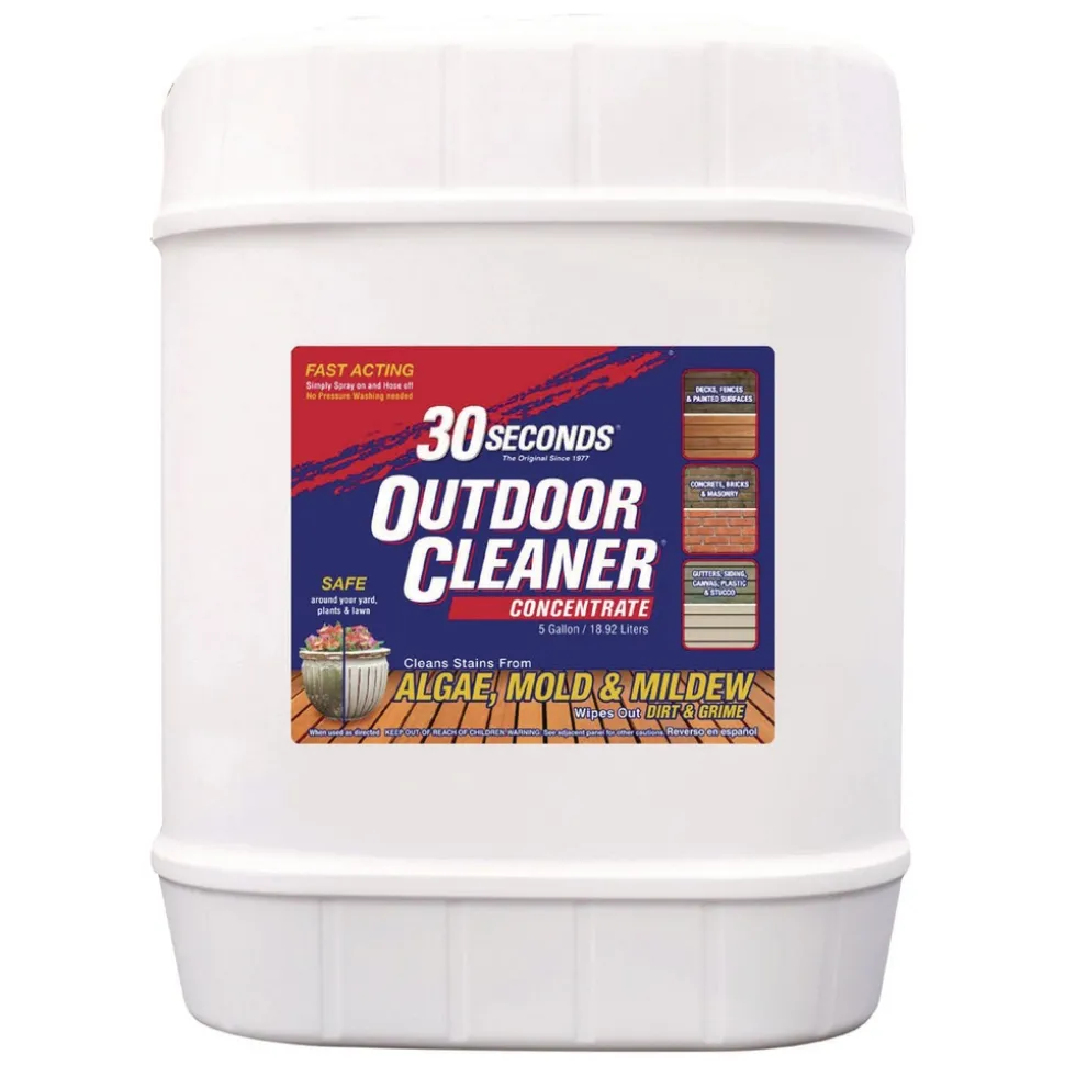 30 Seconds Outdoor Cleaner original formula since 1977, cleans virtually anything outdoors. It’ ideal for cleaning stains from algae, mold and mildew while washing away dirt and grime. Our product powerfully cleans composite and wood decks, gutters, lanais, pool cages, stucco, patio furniture, canvas awnings, vinyl fences, painted metal, boats, concrete, walks, fiberglass, and just about any and all outdoor surfaces. This concentrated formula mixes 1:1 with water and will clean up to 600 sq ft per bottle, depending on the level of staining and porosity of the surface. It’s clean, when You want it clean! Save water, energy and time by skipping the pressure washer. 30 Seconds Outdoor Cleaner breaks down readily in the soil so it won’t harm lawns and landscaping when used as directed.