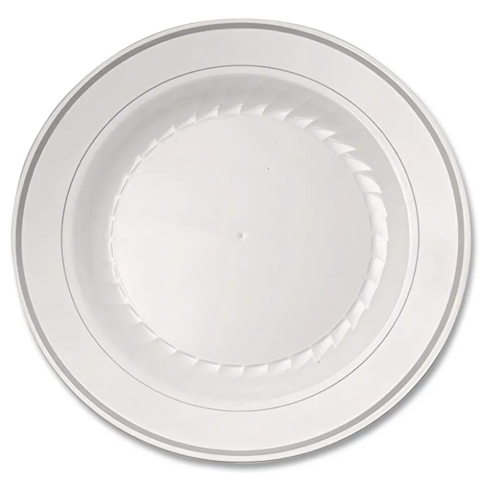 (120/Carton) 10.25 in. Diameter Masterpiece Plastic Plates – White/Silver – RSM101210WS