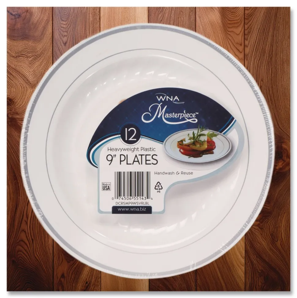 WNA RSMP91210WS 9 in. Diameter Masterpiece Plastic Plates – White/Silver (120/Carton)
