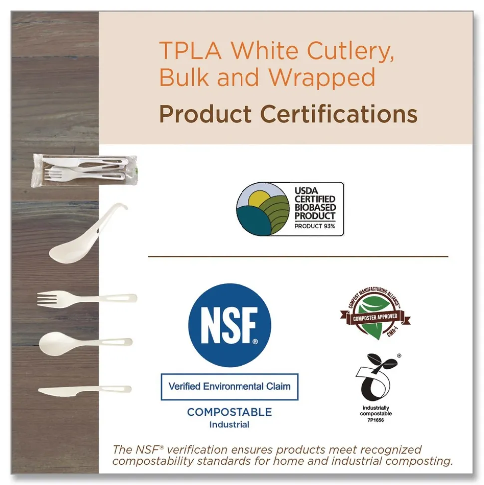 Made of talc-injected non-GMO corn-derived polylactic acid (TPLA), get all the benefits of disposable plastic cutlery without the downsides